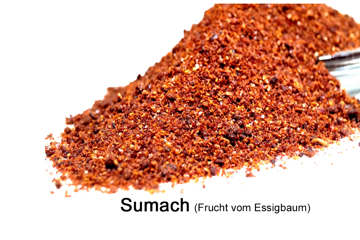 Sumach wird auch in unseren Breitengraden immer beliebter. z.B.in der türkische und arabischen Küche.Es unterstützt die besondere Umami- Geschmacksrichtung.