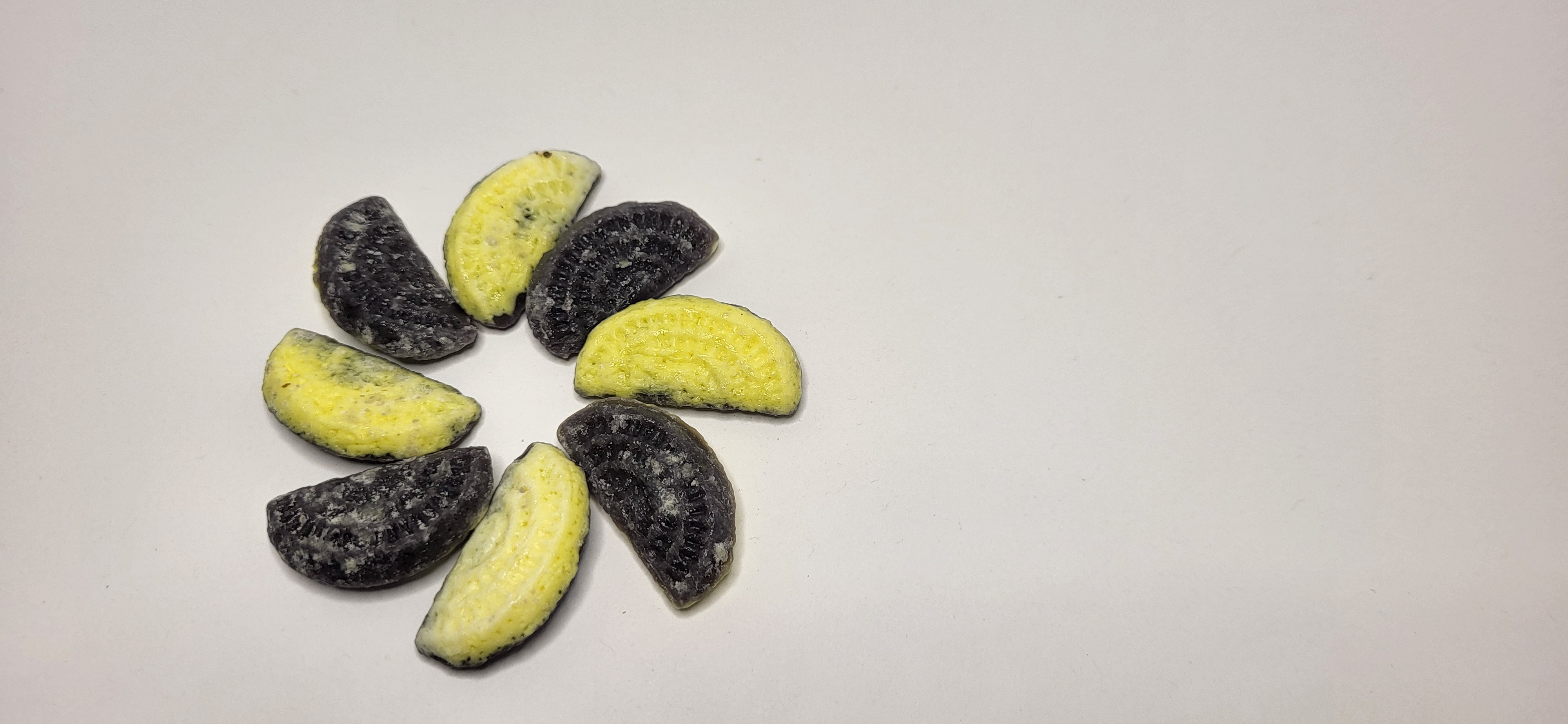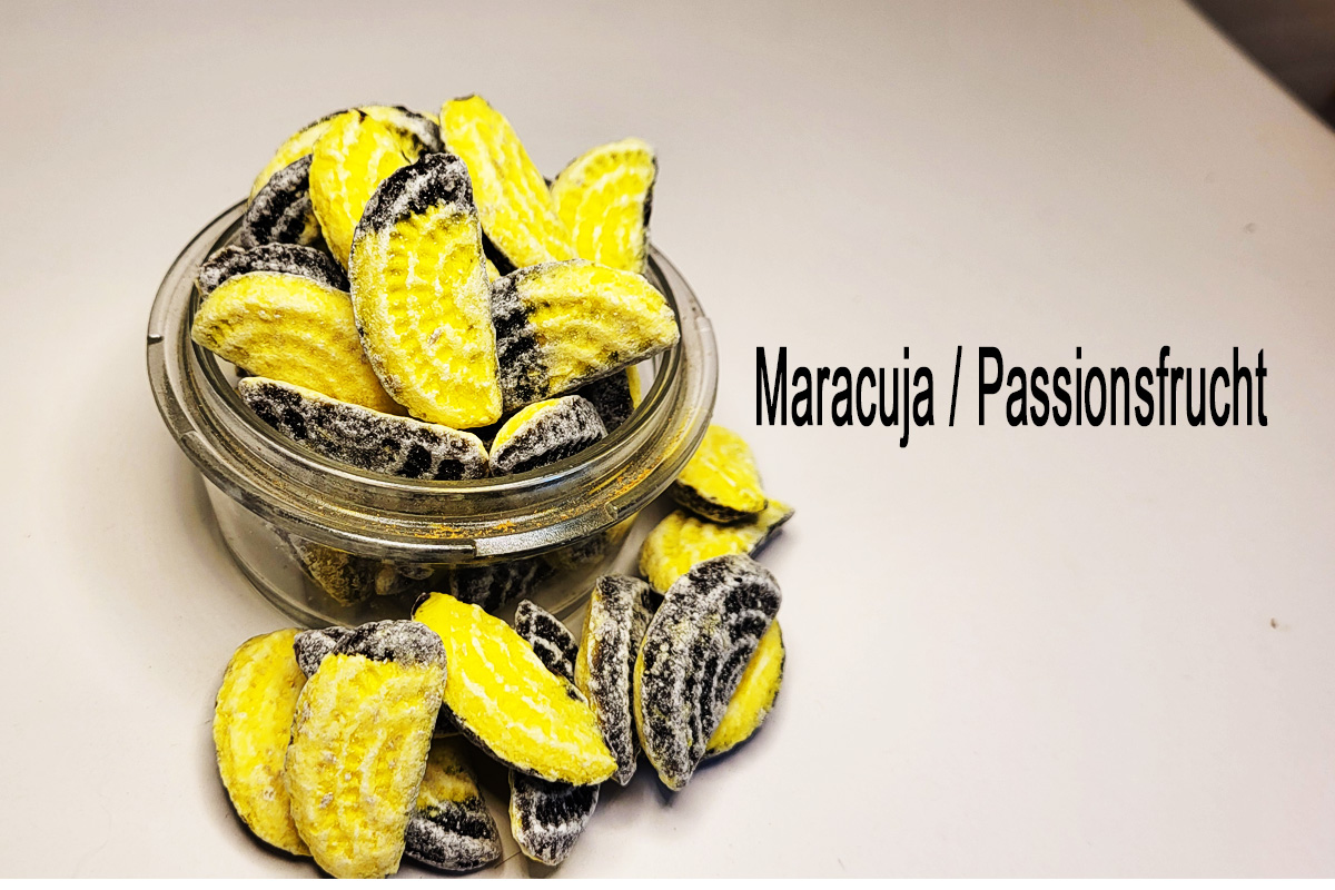 fruchtige Bonbons mit Maracujageschmack mit natürlichen Aromen und natürlichem Farbstoff
